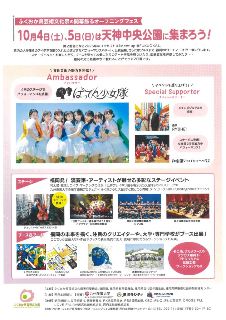 10月4日(土)、5日(日)の2日間、県営天神中央公園 ふくおか交流おまつり広場(芝生広場)において「ふくおか県芸術文化祭オープニングフェス」が開催されます。
