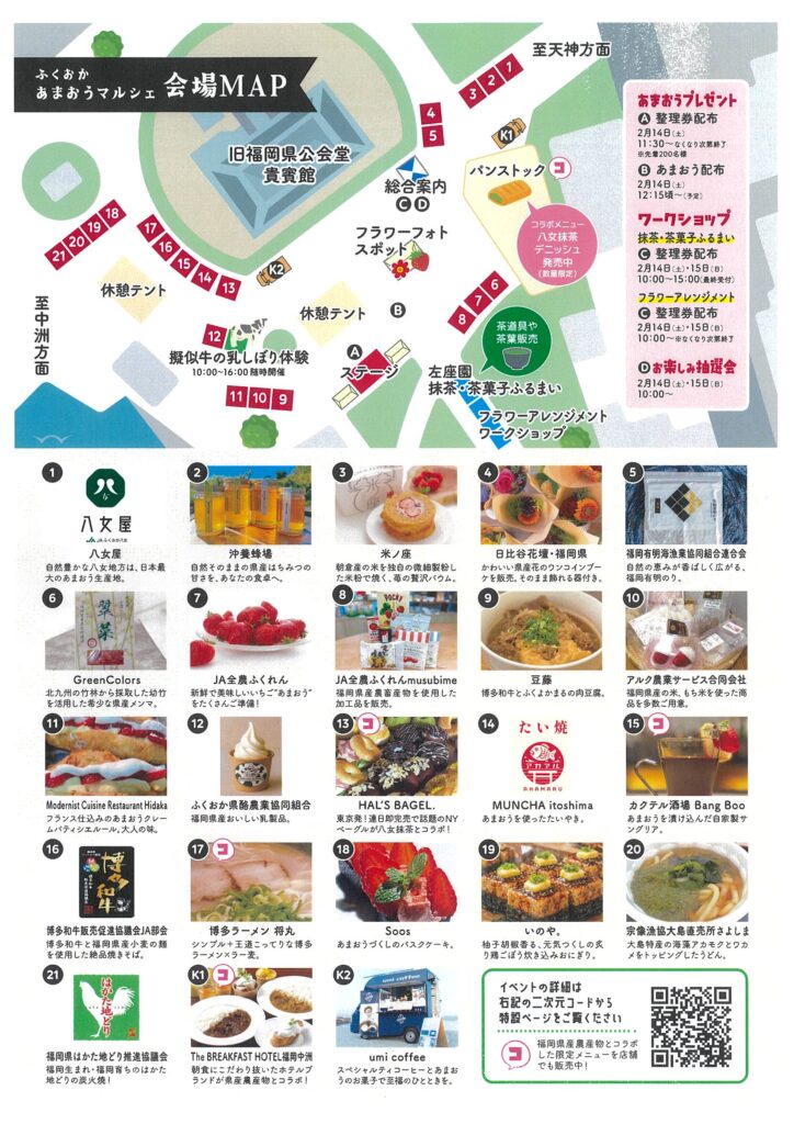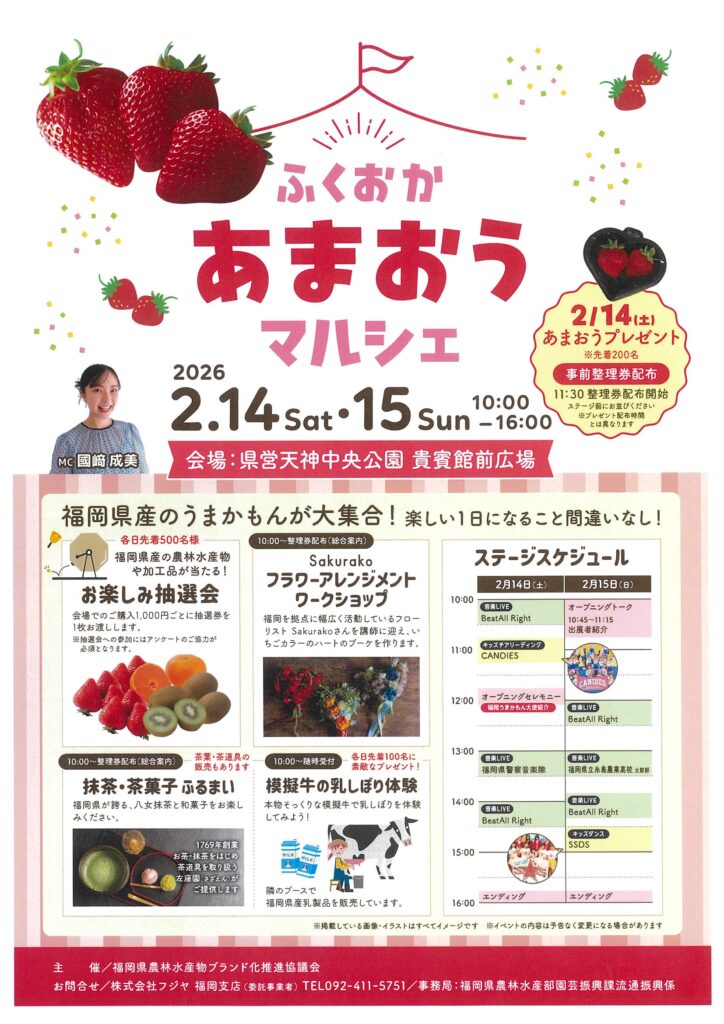 先着200名に「あまおう」プレゼントの企画や抹茶や和菓子のふるまい、模擬牛の乳しぼり体験、フラワーアレンジメントワークショップなど盛りだくさんの内容となっています。