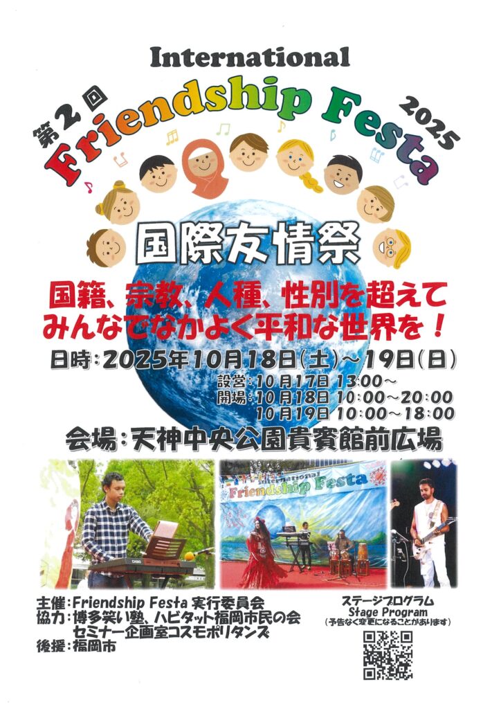 10月18日(土)、19日(日)の2日間、県営天神中央公園 西中洲エリア貴賓館前広場において「第2回 International Friendship Festa」が開催されます。