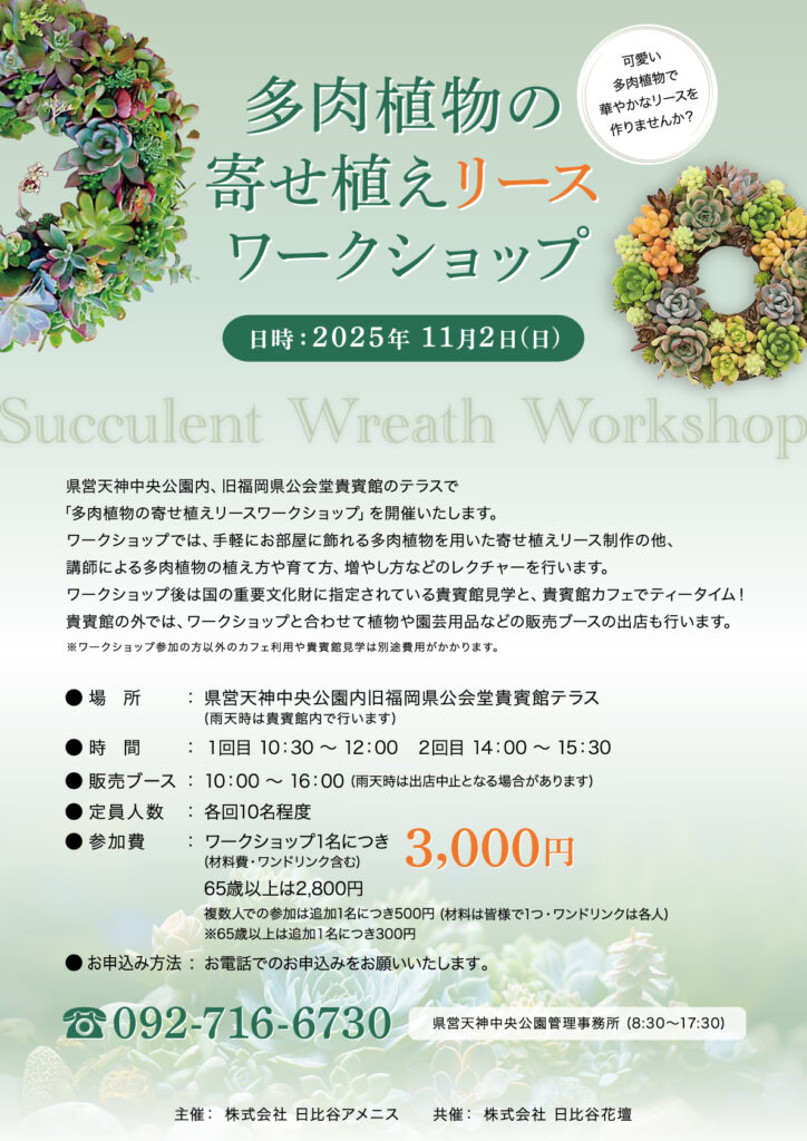 11月2日(日)県営天神中央公園内、旧福岡県公会堂貴賓館のテラスで「貴賓館で多肉植物の寄せ植えリースワークショップ」を開催いたします!