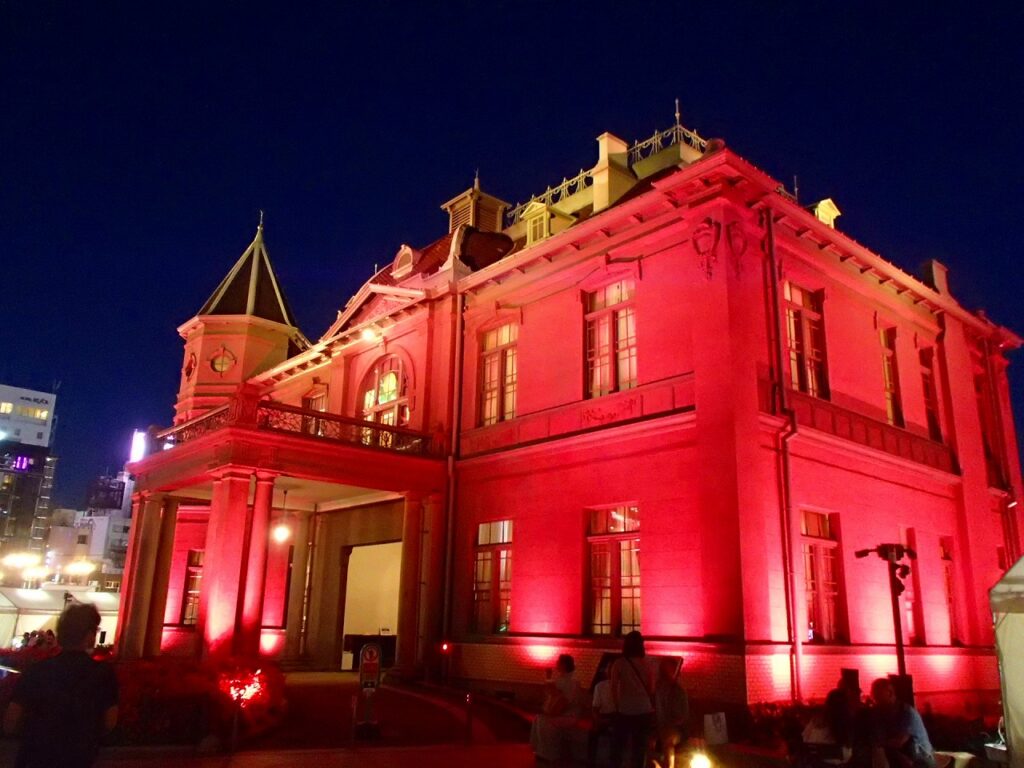 また、旧福岡県公会堂貴賓館ではHIV感染者・エイズ患者への理解と支援の象徴である「レッドリボン」にちなみFUKUOKAモニュメントと合わせてレッドにライトアップを行います。
